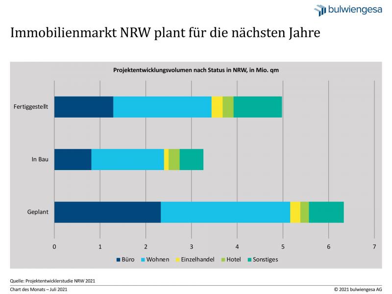 Unter der Annahme, dass die Bautätigkeit in ländlichen Regionen relativ geringer ist als in Stadtregionen, schätzt bulwiengesa das gesamte Projektentwicklungsvolumen in Nordrhein-Westfalen in einer Hochrechnung auf ca. 50 Mio. qm. für Büro-, Wohn- und sonstige Flächen.