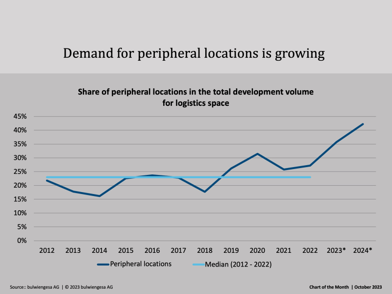 Land availability and energy efficiency or ESG compliance are sometimes more important than proximity to a metropolis or belonging to a logistics region. Compared to a share of 23 % held by peripheral locations in the overall development volume on a long-term average (2012-2022), the pipeline in particular shows a very clear trend here.