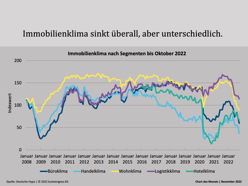 In den einzelnen Assetklassen verschlechtert sich das Stimmungsbild ebenfalls zunehmend – alle betrachteten Segmente müssen teils deutliche Rückschläge hinnehmen. Besonders groß ist der Vertrauensverlust beim Handelklima – der Handelimmobilienmarkt wird in der Oktoberbefragung am schwächsten eingeschätzt und bricht um deutliche 28,0 % auf nun 37,1 Punkte ein. Mit einem Minus von 16,4 % auf nun 59,6 Punkte verzeichnet das Büroklima den zweiten Monat in Folge einen zweitstelligen Verlust. Das Hotelklima (-6,7 % auf nun 66,5 Punkte) sowie das Wohnklima (-3,8 %) geben ebenfalls weiter nach. Mit einem Stand von 89,6 Punkten sinkt das Wohnklima erstmals seit Januar 2009 wieder unter 90 Punkte. Der Logistikimmobilienmarkt weist trotz Rückgang (-5,2 % auf 114,4 Punkte) auch weiterhin den höchsten Wert auf.