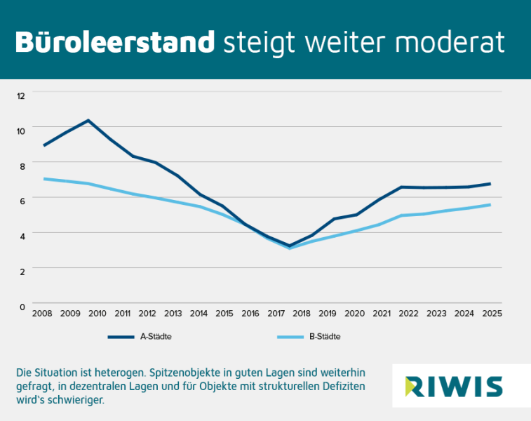 Für den Leerstand mit entscheidend ist auch der „Flight zu Quality und Location“. Während Spitzenobjekte in guten Lagen weiterhin gefragt sind, ist die Situation in dezentralen Lagen und in wirtschaftlich schwachen Regionen, sowie generell für Objekte mit strukturellen Defiziten, schwieriger.