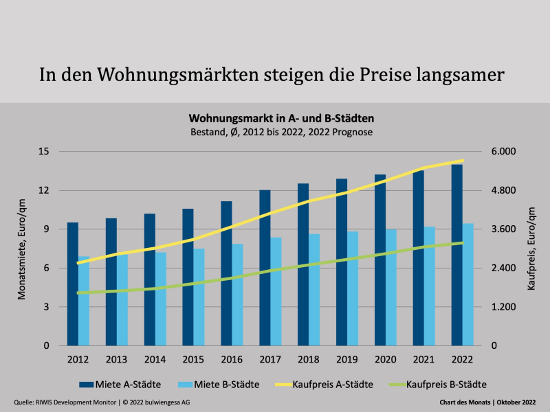 In vielen Städten besteht seit Jahren ein Nachfrageüberhang, der sich in letzter Zeit durch eine zu geringe Bautätigkeit noch vergrößert hat. Dennoch hat die Erschwinglichkeit weiter abgenommen. Die derzeit stark ansteigenden Energiepreise führen zu einer weiteren Verteuerung der Wohnkosten. Dabei wird die Angebotsknappheit auch mittelfristig den Markt bestimmen. Dieser ist gekennzeichnet von Lieferengpässen, steigenden Baukosten und Fachkräftemangel. Zusätzlich wirkt sich die derzeitige Zinsentwicklung sowohl auf die Angebots- als auch die Nachfrageseite aus.