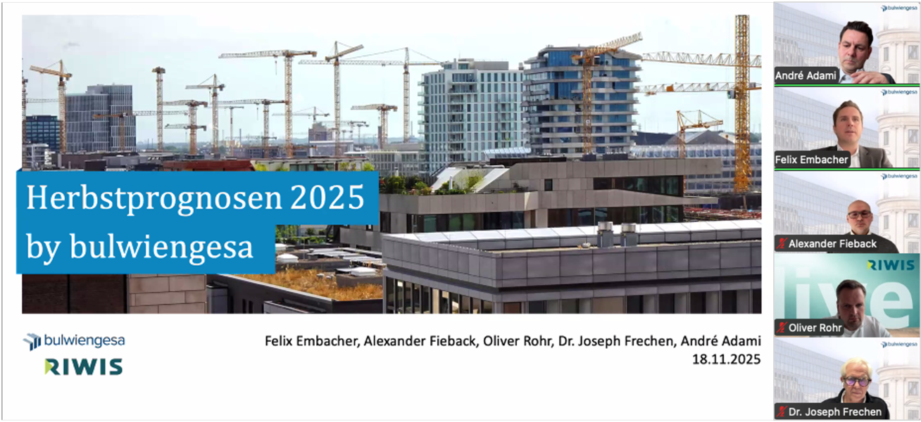 Zum zweiten Mal in diesem Jahr hat bulwiengesa umfassende Prognosen zur Entwicklung der Immobilienmärkte in Deutschland veröffentlicht - basierend auf volkswirtschaftlichen Rahmenbedingungen und Analysen aus der hauseigenen Immobiliendatenbank RIWIS. Die aktuellen Herbstprognosen wurden am 18. November 2025 in einem Webinar vorgestellt.