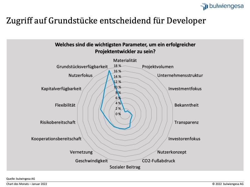 Bei der Frage, welches der wichtigste Parameter sei, um ein erfolgreicher Projektentwickler zu sein, spielte der Zugriff auf Grundstücke mit 17,3 % der vergebenen Punkte die größte Rolle. Die Orientierung auf den Nutzer folgt auf Rang 2 (11,8 %), weit vor dem Investorenfokus auf Rang 12 (2,8 %). Die Kapitalverfügbarkeit nimmt trotz der aktuell niedrigen Zinsen und des hohen Investmentinteresses in Immobilien immerhin den dritten Rang ein (9,6 %). Der CO2-Fußabruck als Zukunftsthema rangiert dagegen nur im Mittelfeld (5,2 %).