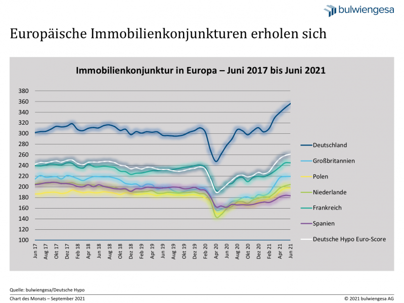 Die deutsche Immobilienkonjunktur hat deutlich zugelegt – das zeigt der europäische Immobilienscore, den wir quartalsweise für die Deutsche Hypo erstellen. Mit plus 8,1 Prozent bildet er einen neuen Spitzenwert und notiert sogar über Vorkrisenniveau. Schön zu hören: In allen betrachteten Ländern kann eine zunehmende Erholung festgestellt werden.